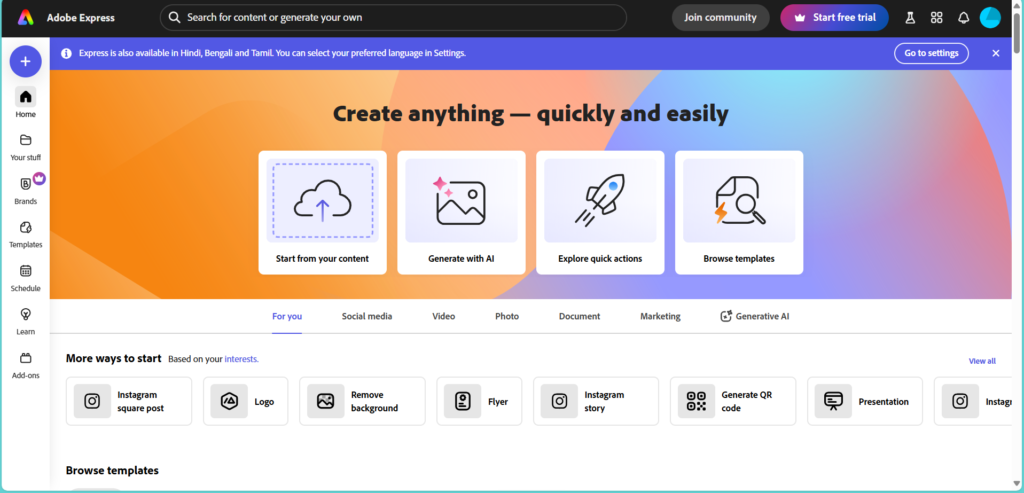 Adobe Express (formerly Adobe Spark) combines Adobe’s industry-standard quality with ease of use. It’s a fantastic option for those who want complete creative freedom without the steep learning curve of tools like Photoshop or Illustrator.